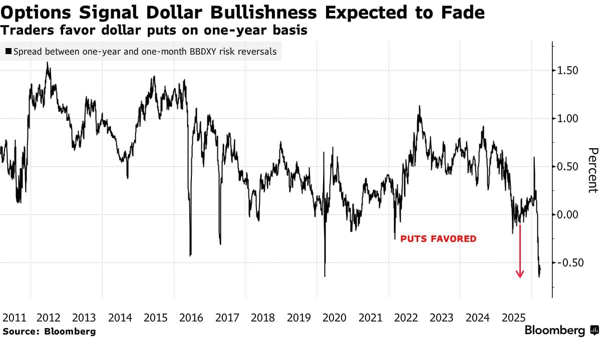 That same theme of positioning and sentiment runs through the dollar options market, where a closely-watched spread between short and long-dated risk reversals has just hit its most negative reading in over a decade. In plain terms, traders are paying up to hedge against dollar weakness over a one-year horizon at a scale not seen since 2016.