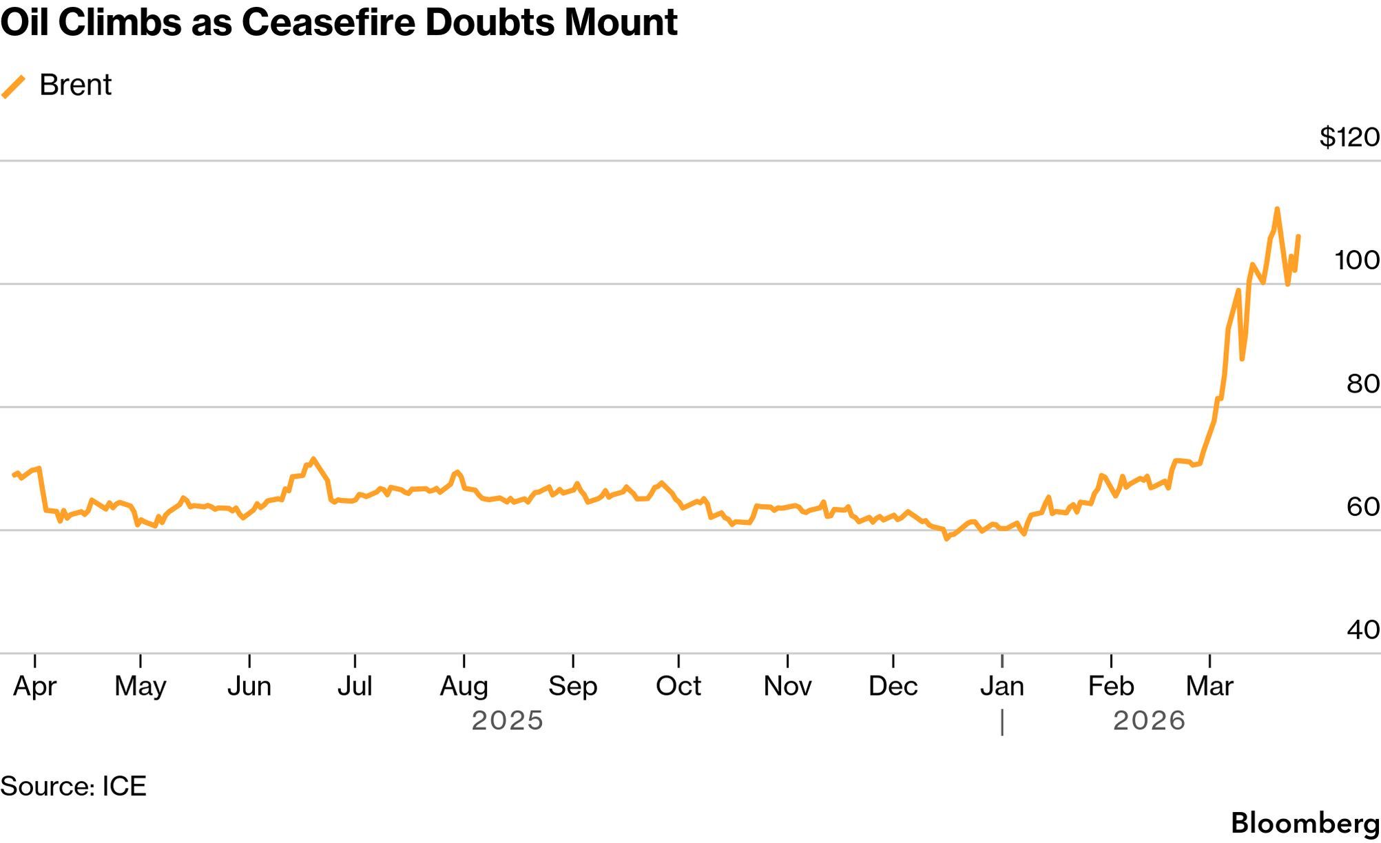 Ceasefire hopes took a direct hit overnight after Iran's Foreign Minister publicly contradicted Trump's claim that negotiations were underway, calling the exchanges through mediators something that "do not constitute negotiations." Brent responded immediately, closing up 5.7% above $108, and the chart makes clear that the market sees no credible resolution on the horizon, oil remains in deep backwardation, meaning futures traders still expect prices to stay elevated well into the second half of the year.