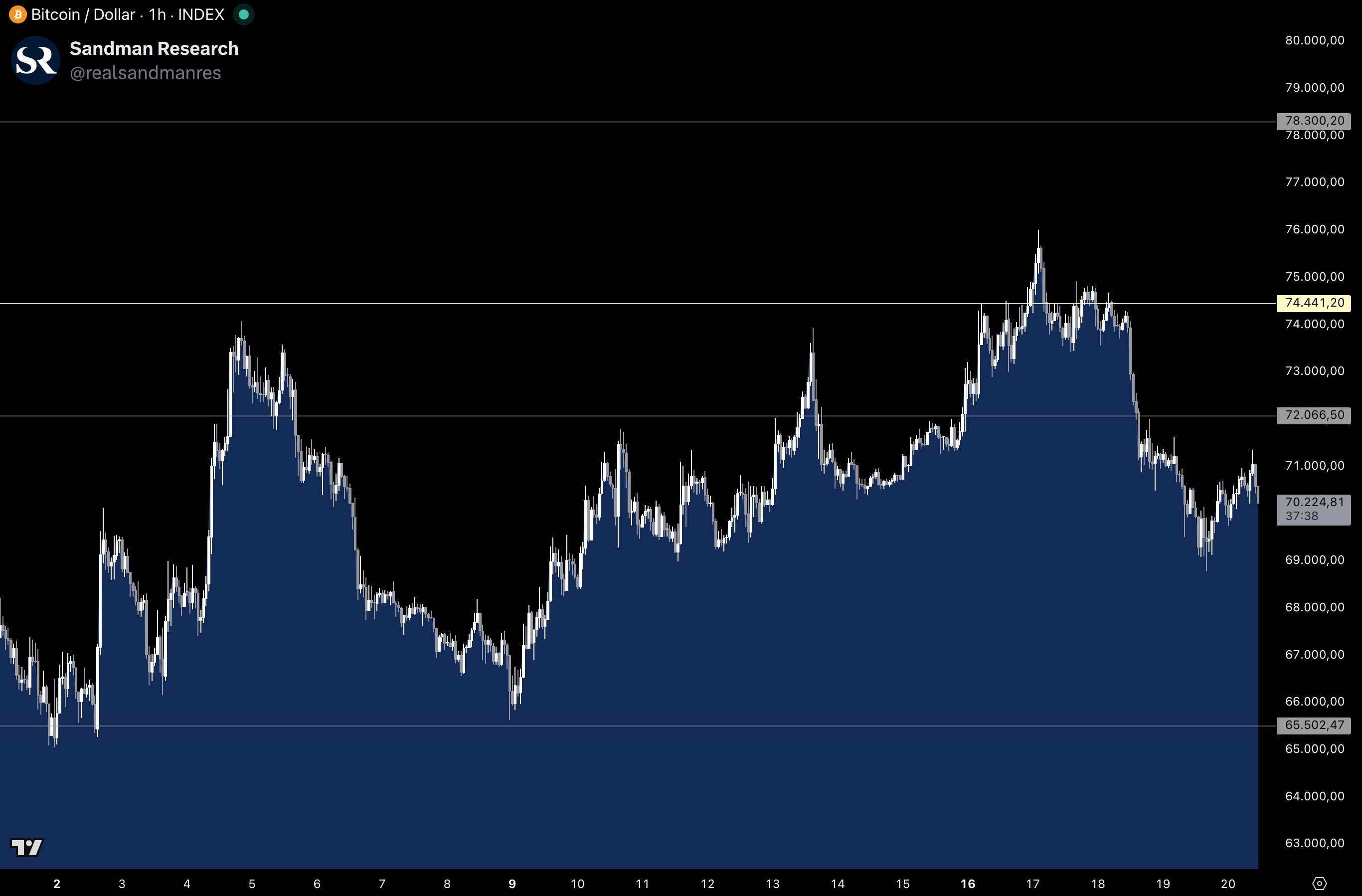 Bitcoin topped at $76,000 on Tuesday and has trended lower throughout the week, losing both the $74,400 and $72,000 support levels in succession. Price currently sits at $70,400, with the next meaningful support at $65,500.
