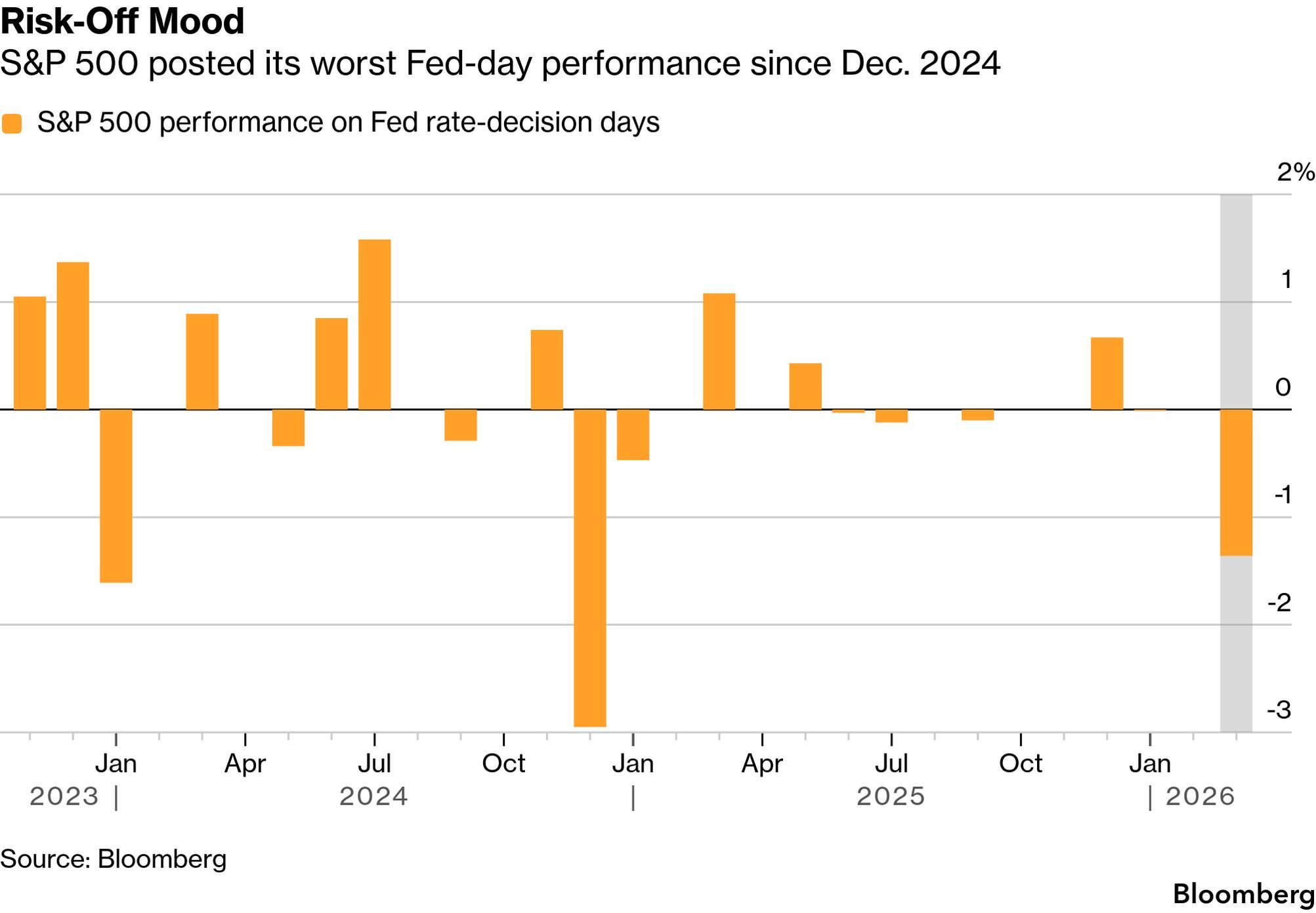 Equities bore the brunt. The S&P 500 posted its worst Fed-day performance since December 2024, dropping roughly 1.5% as Powell made clear that inflation remains too sticky to justify easing. It's a stark contrast to most of 2023 and 2024, when Fed days were reliably positive, back then, every meeting brought the market closer to cuts. Now that logic has inverted.