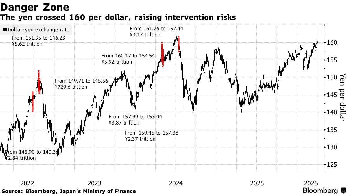A related flashpoint continues building in Japan. The yen has crossed 160 per dollar, precisely the level that triggered multi-trillion-yen interventions in 2024, and Tokyo's Finance Minister is already issuing pointed public warnings. If Japan acts again, the resulting yen spike could force a violent unwind of carry trades, sending shockwaves across every major asset class simultaneously.
