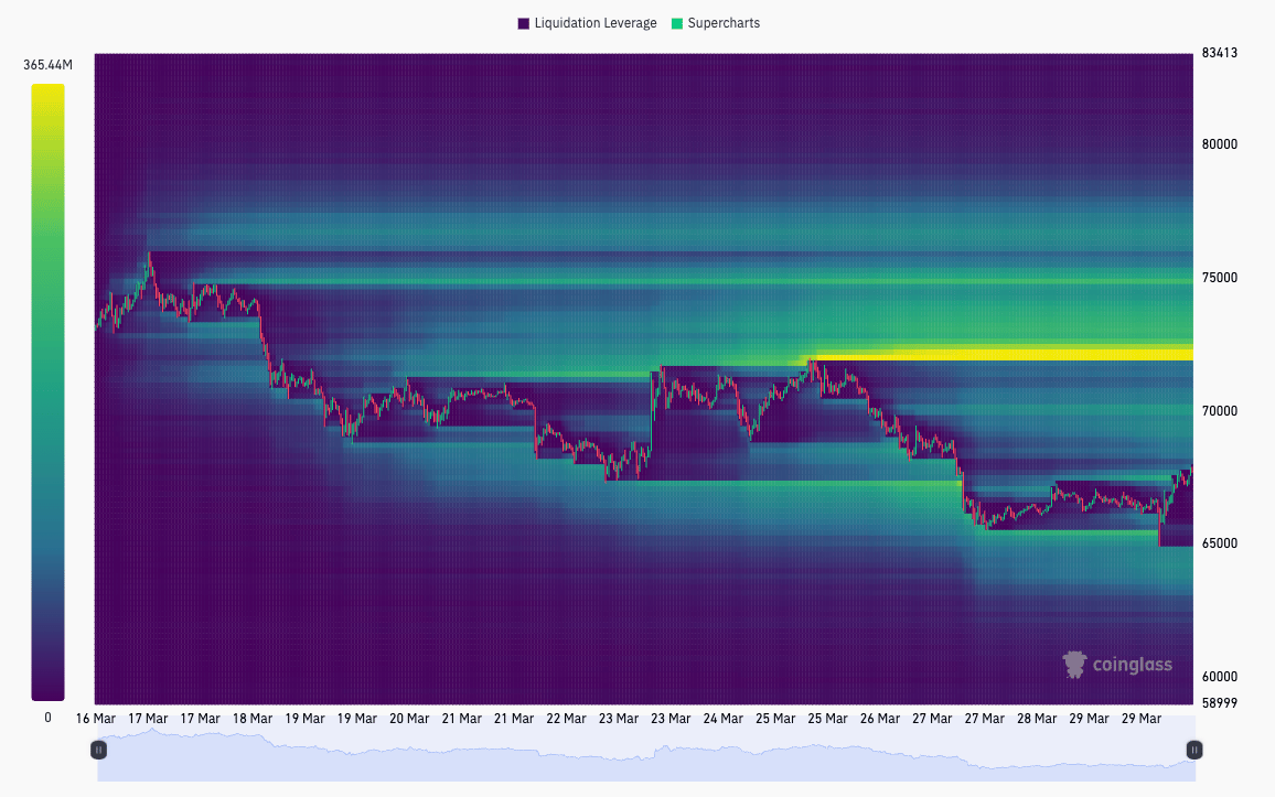 The two-week liquidation heatmap shows Bitcoin having cleared most of the downside liquidity clustered around $65,000 before bouncing higher. The most significant remaining liquidation clusters are now positioned to the upside, concentrated right at the $72,000 technical level, making it a plausible near-term target for early price action this week.
