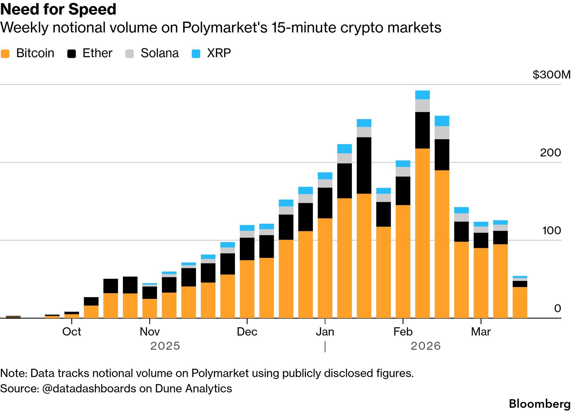 Crypto markets are offering their own read on risk appetite. Weekly notional volume on Polymarket's 15-minute prediction markets, where traders bet on Bitcoin, Ether, Solana, and XRP inside ultra-short windows, surged to nearly $300 million in February before pulling back sharply through March, closely tracking the broader risk-off mood in equities.