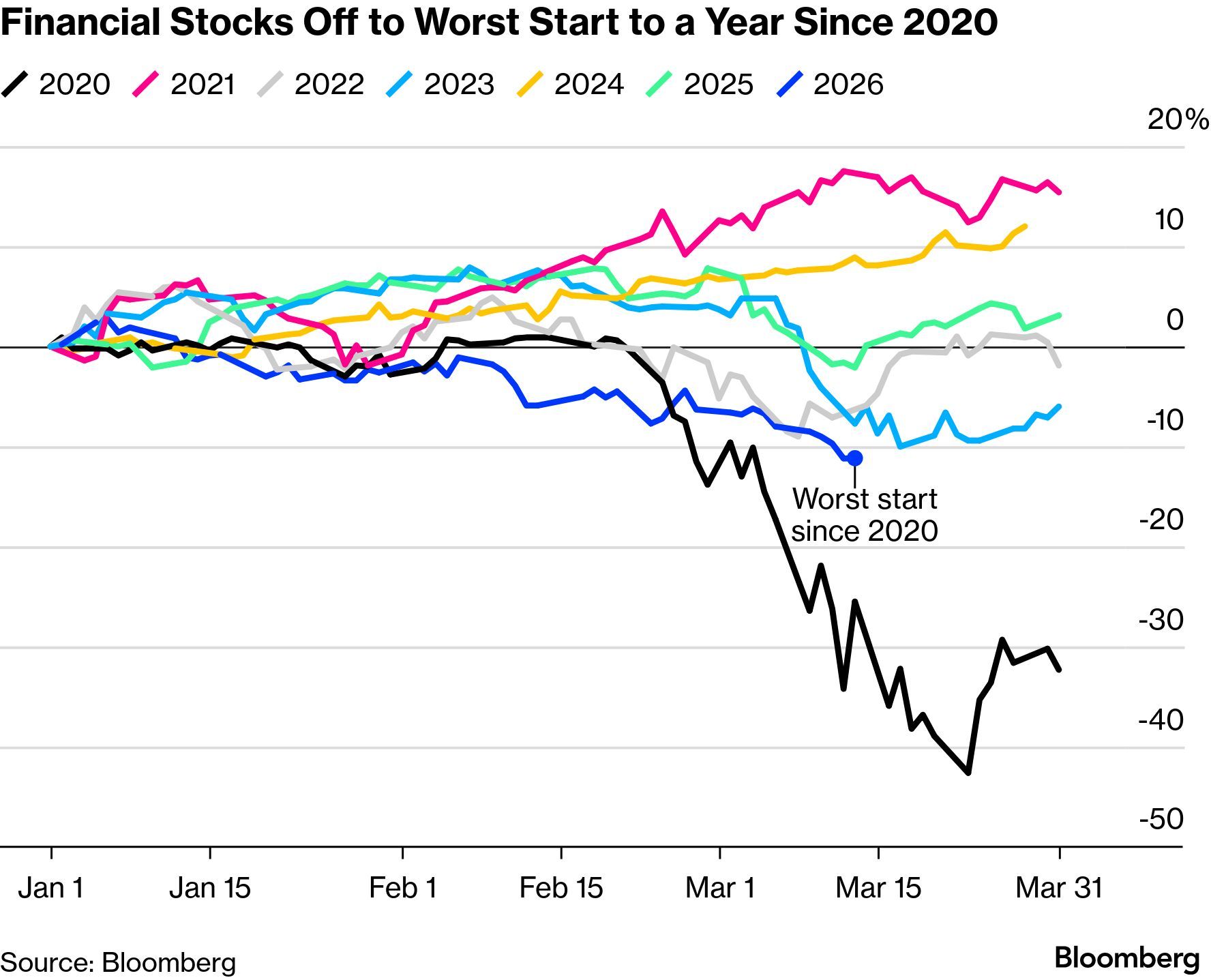 Financial Stocks Off to Worst Start to a Year Since 2020 (Source: Bloomberg)