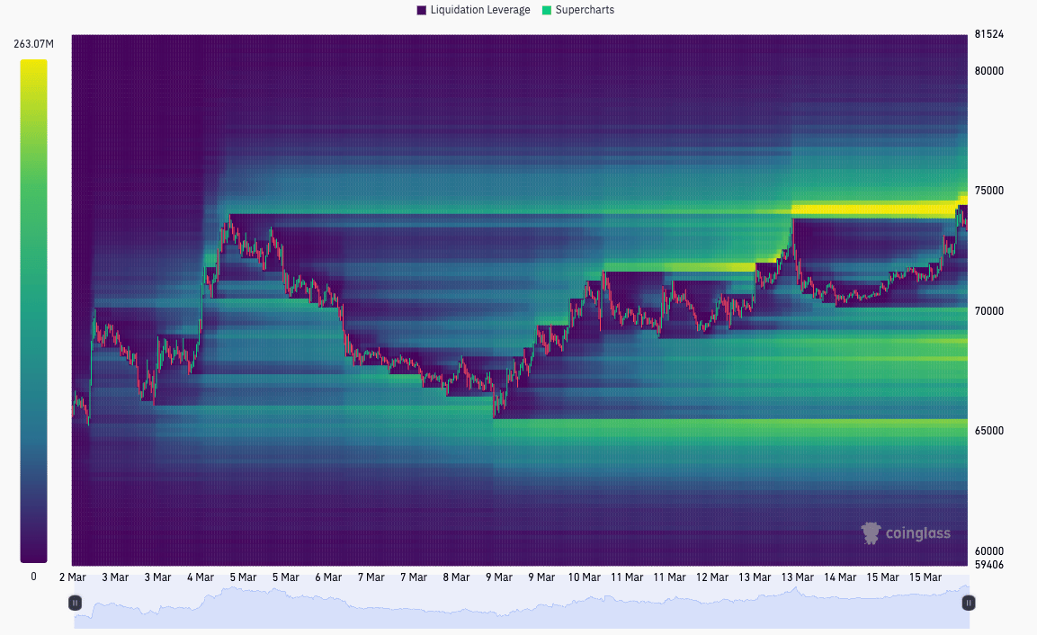 The two-week liquidation heatmap shows Bitcoin taking out the upside cluster, with liquidations around $74,000 being tapped by the current move. Upside liquidations remain in lower volume, spread from current prices up to $77,000, while on the downside, remaining liquidation leverage is clustered around $68,000 and $65,500.