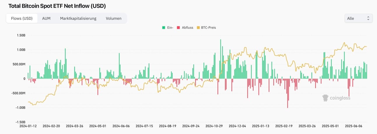 At the same time, total net inflows into Bitcoin spot ETFs have maintained a strong and steady pace, with no net outflows recorded since June 6th. Over the past week alone, daily inflows averaged $442 million.