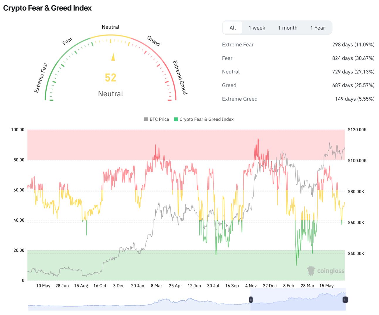 While it was recently in fear territory with a reading of 37, the Crypto Fear and Greed Index has recovered from deeper levels and moved back into neutral, currently sitting at 52, indicating no significant signs of market stress.