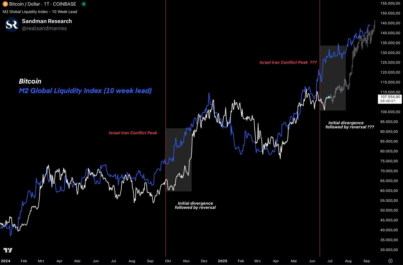 We continue to monitor our Bitcoin-to-Global M2 Liquidity correlation model closely, as it has provided strong confluence since early 2024. According to this framework, we’re once again entering a pivotal phase. It proved highly accurate during the peak of Israel-Iran tensions, particularly when the U.S. struck Iran’s nuclear facilities, but it remains to be seen whether the market will react in a similar way as it did during October–November of last year, when Bitcoin surged sharply after geopolitical stress peaked.