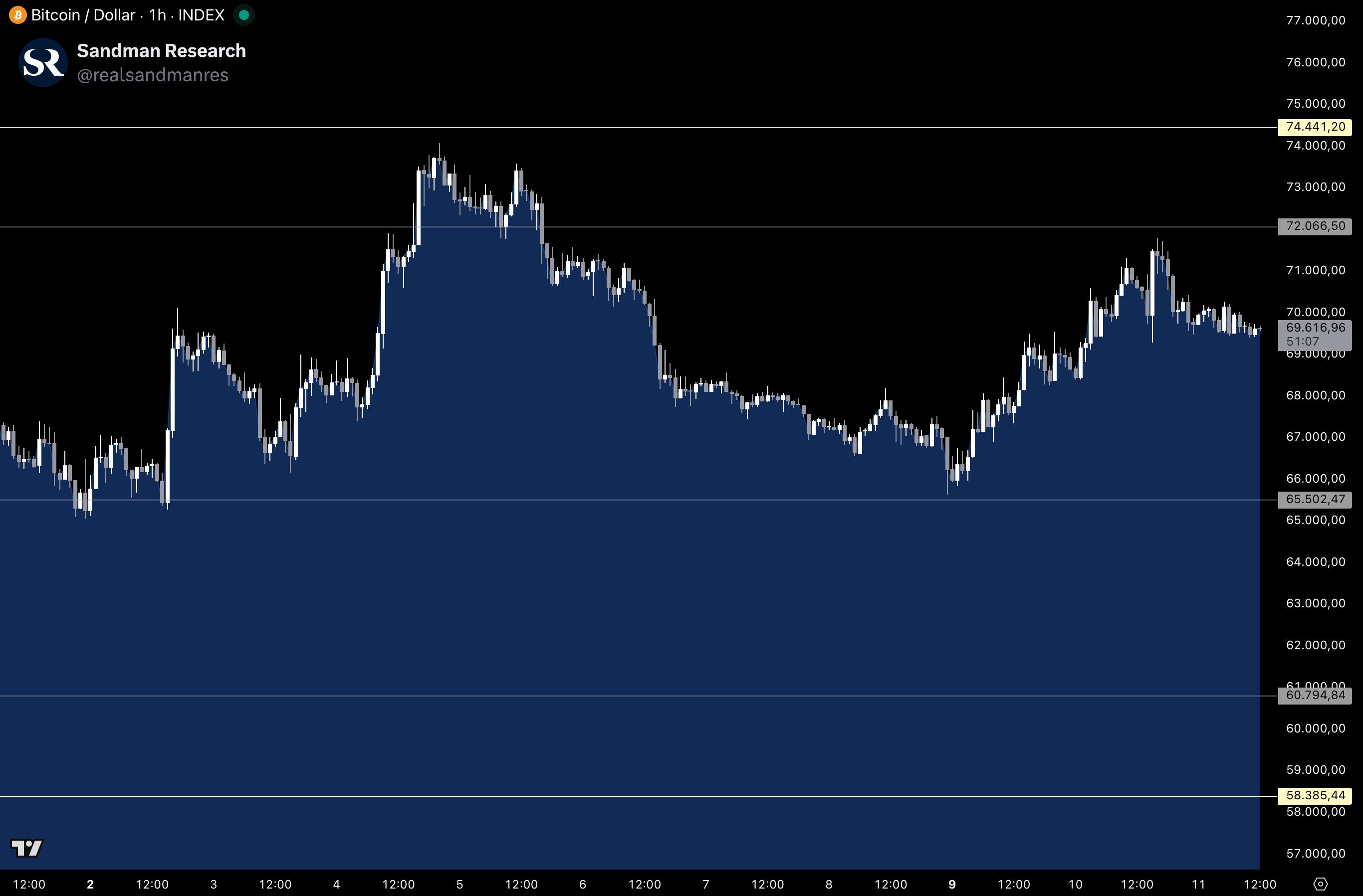 Bitcoin approached the $72,000 resistance level on Tuesday after finding solid support at $65,500 on Monday. Price briefly tagged $72,000 before pulling back, and is currently trading around $69,500, effectively the midpoint of the established $65,500–$72,000 range.