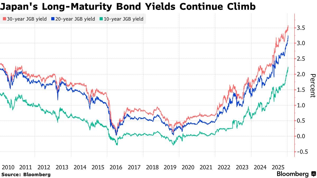 Stress is also building in global bond markets. Japanâs 30-year government bond yield climbed to a record 3.615%, while the 10-year yield reached 2.25%, levels last seen in 1999. The move followed reports that Prime Minister Takaichi may cut food taxes ahead of a snap election, reviving concerns around Japanâs fiscal trajectory at a time when debt servicing already consumes roughly 25% of the national budget. Rising yields reflect deeper fears, as decades of ultra-loose monetary policy are unwinding, with implications for global carry trades and risk asset valuations.