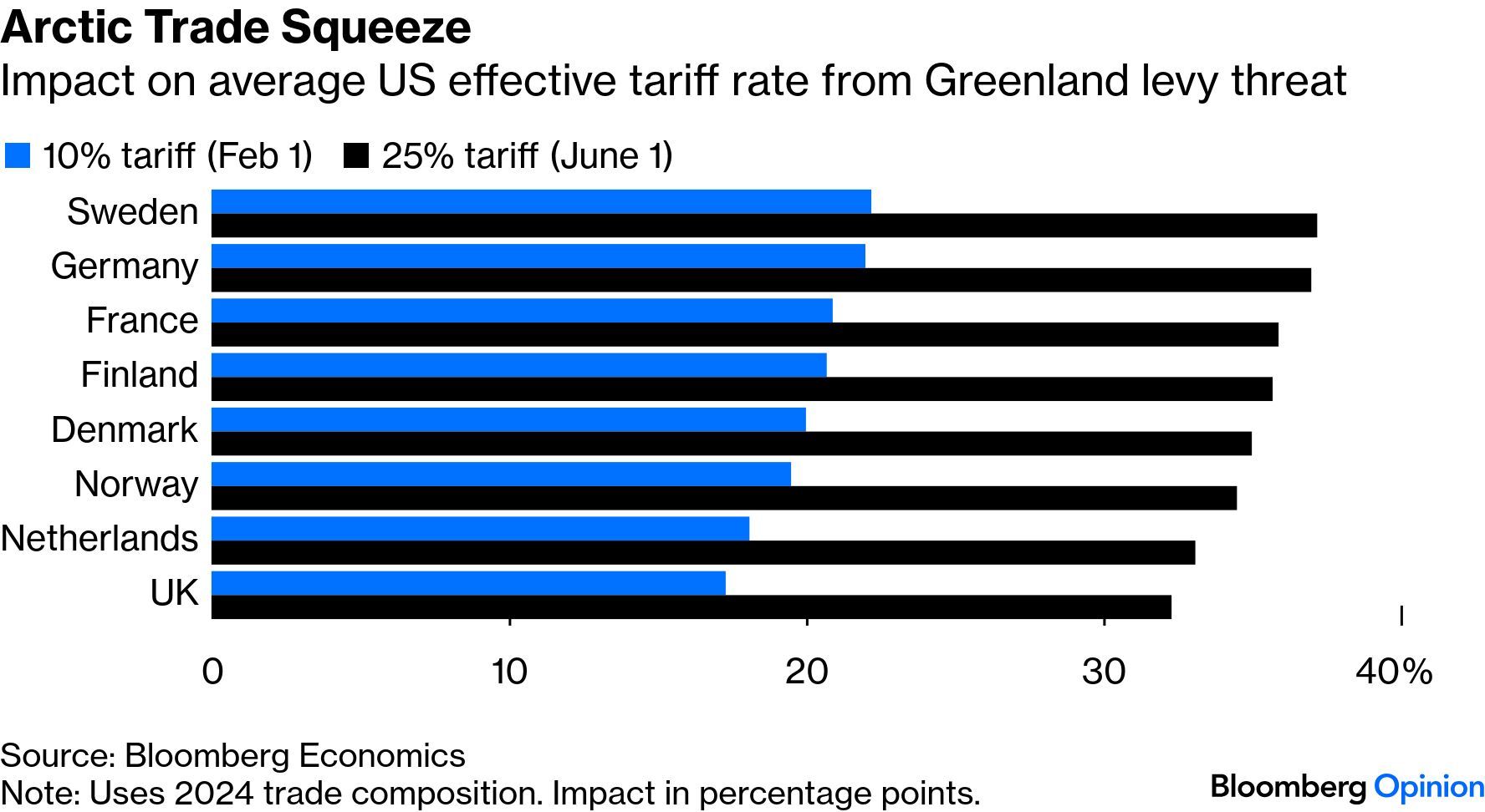 Trumpâs latest tariff ultimatum tied to Greenland triggered an immediate shock across markets. Under the proposal, eight NATO allies would face a 10% tariff on all exports to the US starting February 1, escalating to 25% by June 1 if Denmark refuses to sell Greenland. Sweden, Germany, and France would be among the hardest hit. Both Denmark and Greenland have categorically rejected the demand, raising the probability that tariffs move to the maximum level. If implemented, effective US tariff rates on Swedish and German exports could approach 37%, a scale that would materially disrupt transatlantic trade flows and strain decades of NATO cooperation.