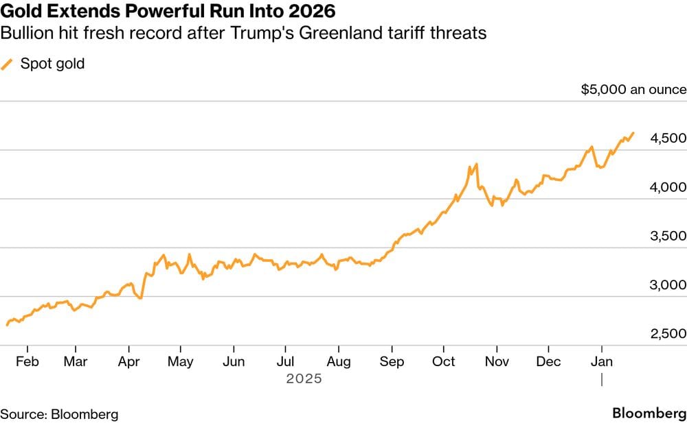 At the same time, capital rotated decisively into traditional safe havens. Gold surged above $4,600 per ounce, printing fresh all-time highs. The metal is up roughly 67% through 2025 and continues to grind higher in early 2026. The tariff standoff reinforced goldâs role as the primary beneficiary of risk-off flows, absorbing capital that in previous cycles might have been split across multiple defensive assets.