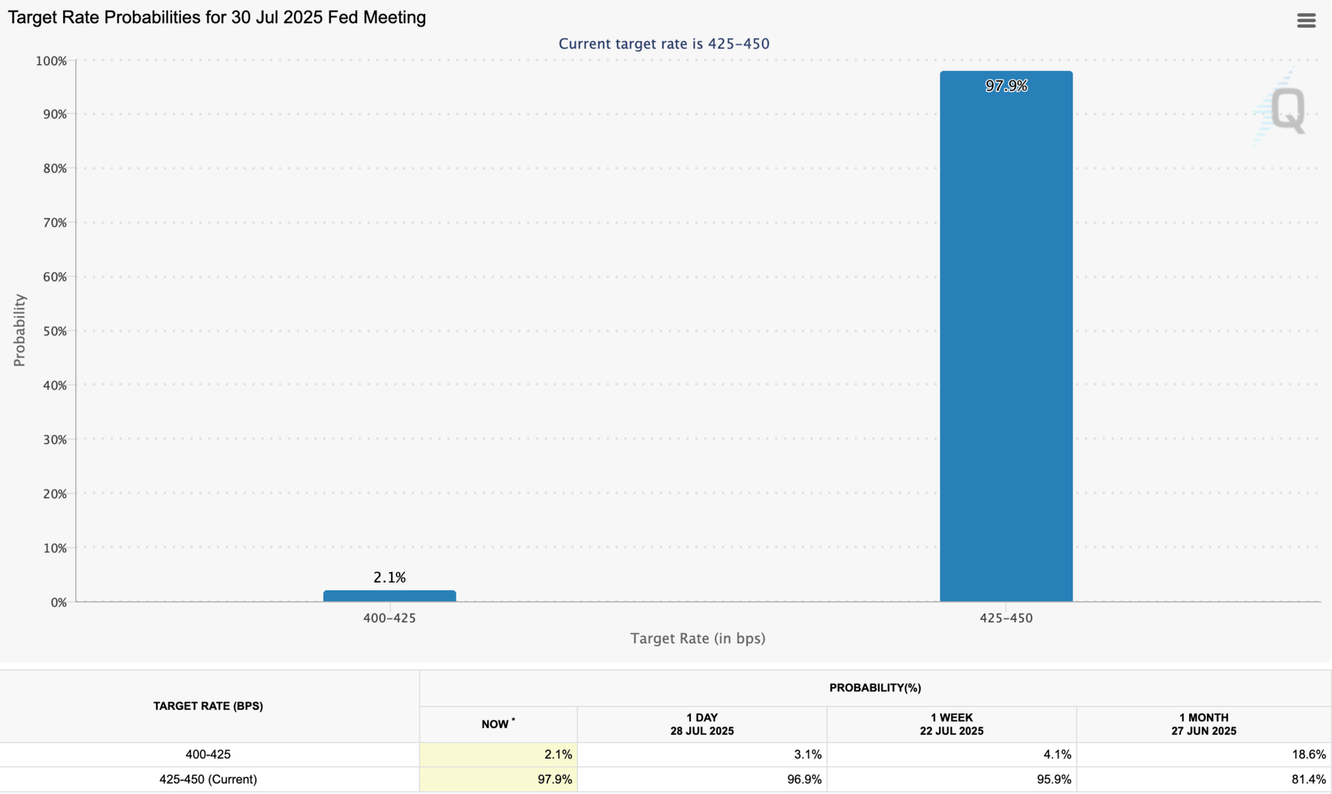 Target Rate Probabilities for 30 Jul 2025 Fed Meeting (Source: CME FedWatch)