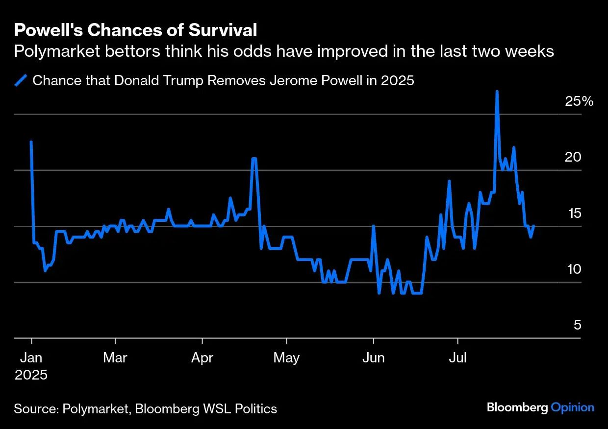 After peaking above 25%, betting markets now price Powellâs chance of removal at ~15%. The narrative of imminent political fallout has softened. This reduces immediate uncertainty, but the political shadow remains, reinforcing the appeal of non-sovereign assets like Bitcoin.