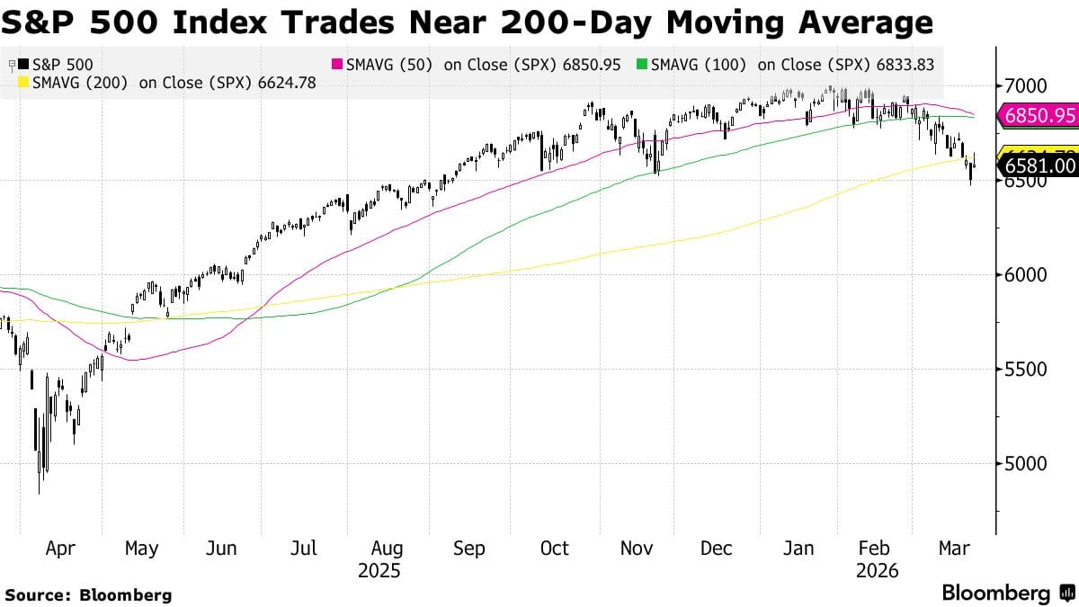 That broader environment remains fragile, as the S&P 500's price chart makes clear. The index is now trading right at its 200-day moving average, a widely watched technical level that, if broken convincingly, would likely trigger a wave of further selling. What's notable is how far the index has fallen from its highs while still sitting above that long-term trend line, meaning the technical picture is deteriorating but hasn't broken down completely.