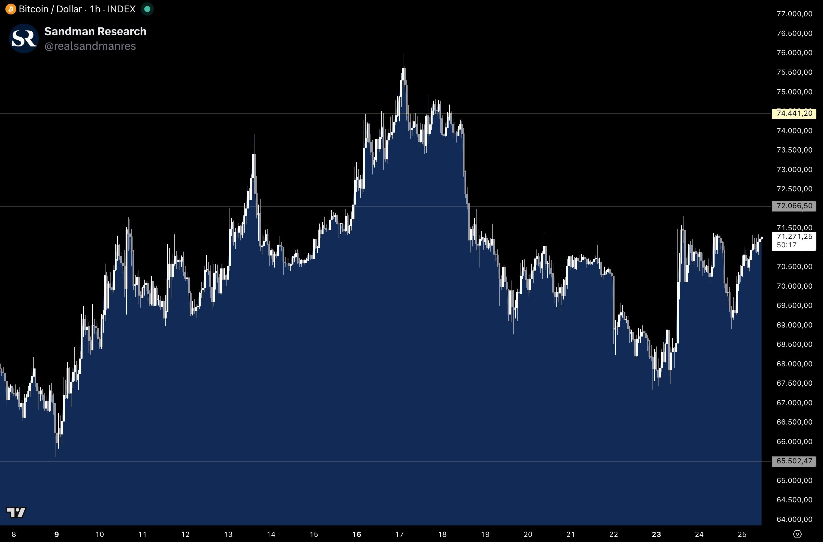 Bitcoin traded lower throughout the past week until this Monday, when price shot up sharply on Trump's statements, almost reaching the $72,000 technical level before pulling back again. Bitcoin therefore remains rangebound between $65,500 and $72,000, currently trading right at $70,900.